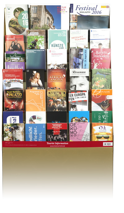 Der Hotelverteiler informiert den Hotelgast über die kulturellen und touristischen Einrichtungen der Region Stuttgart. In den attraktiven Displays finden Touristen, Geschäftsreisende und Messebesucher die aktuellen Programme aus Stuttgart und Umgebung – alles auf einen Blick.